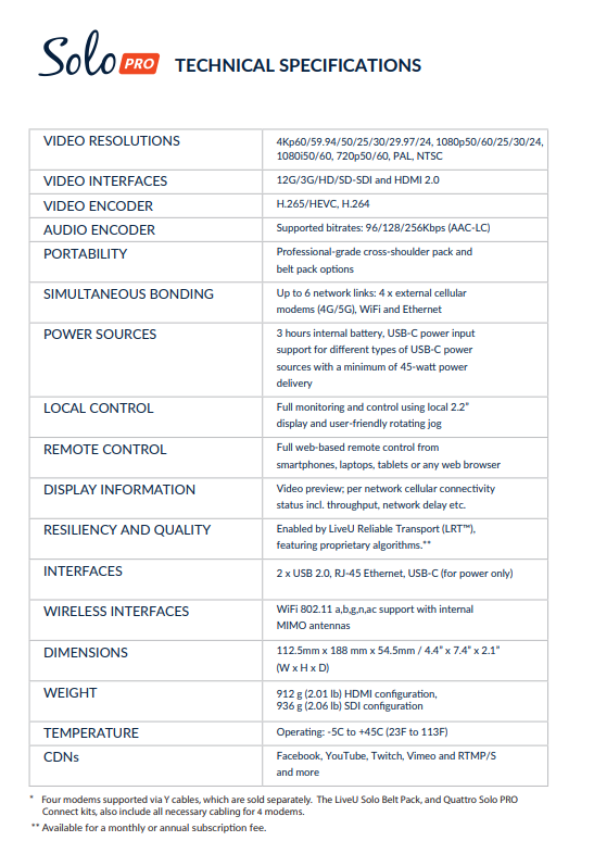 LiveU Solo Pro HDMI Encoder 4K Video/Audio